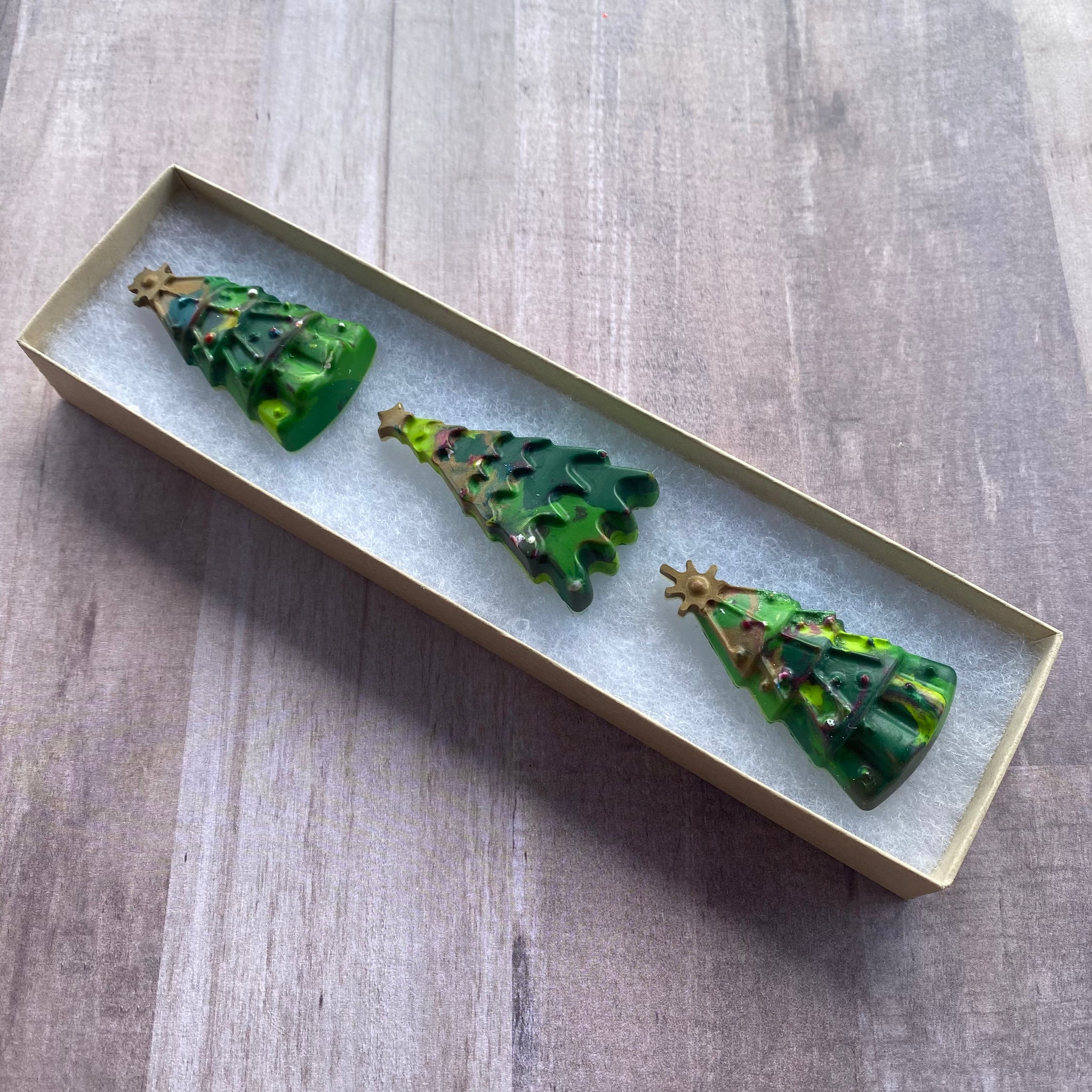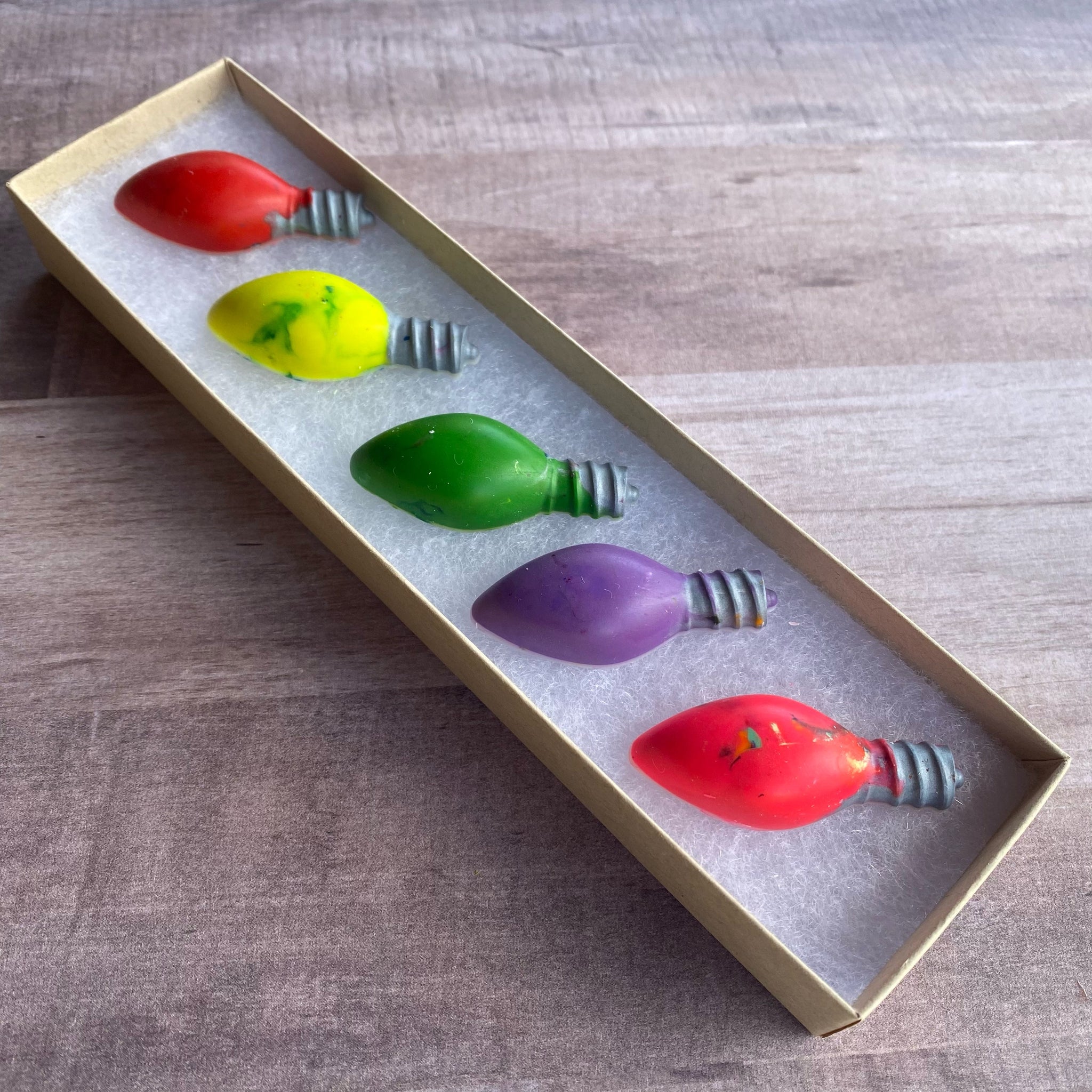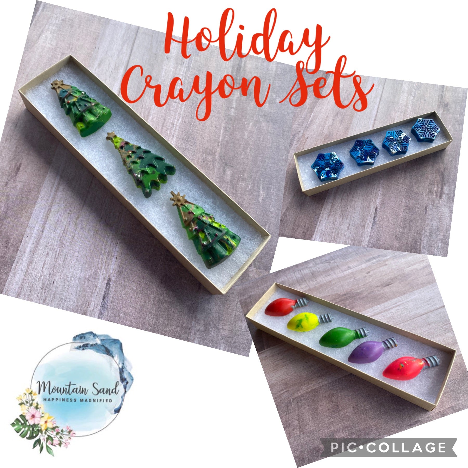All sets come in a gift box tied up with a bow at no extra cost. Sizes vary by shape and colors will vary slightly with each set. Tree sets contain three crayons, light sets contain 5 crayons, and snowflake sets contain 4 crayons.